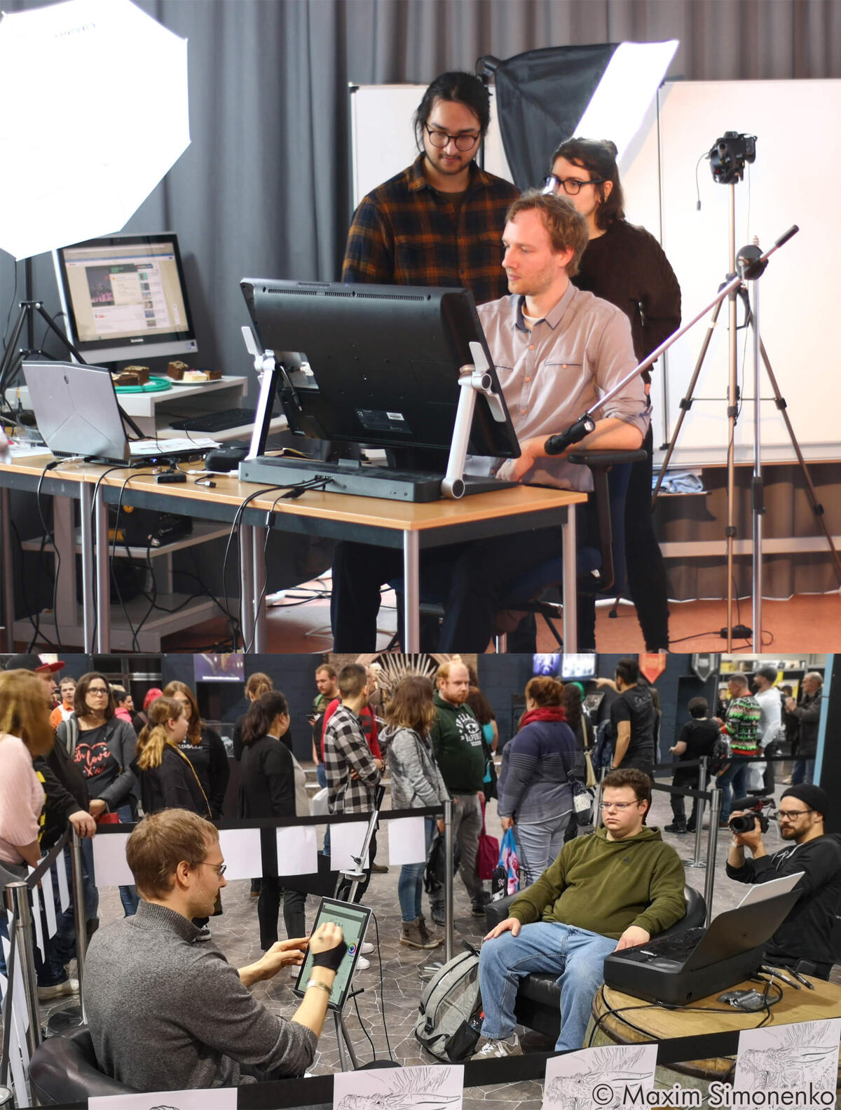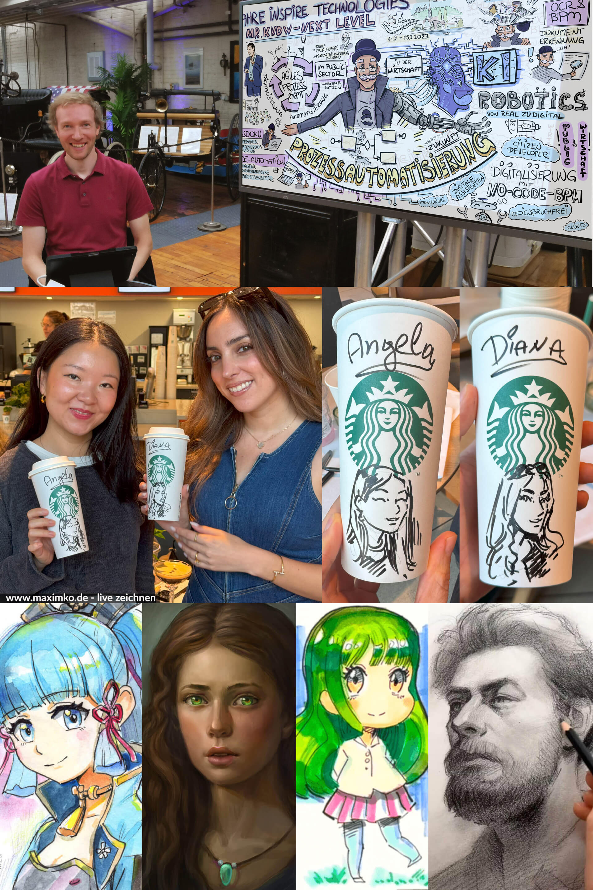 2020-2024: ライブポートレート、シーン描画、グラフィックレコーディングの依頼が殺到 ライブ描画の仕事がこれほど発展するとは驚きでした。素晴らしいクライアントに恵まれ、仕事は多種多様で、報酬も納得のいくものでした。正直、「ドイツはアーティストには向かない国だ」と思っていましたが、その考えは完全に変わりました。これほどアーティストが重宝され、高い報酬が得られる国を私は他に知りません。特にキャリア初期、KSK(芸術家社会保険)制度には本当に助けられました。ライブ描画の幅をシーン描画やグラフィックレコーディングへ拡大 ポートレートを描くのは大好きですが、何千、何万という人を描き続けるのはかなりのプレッシャーでもあります。そこで、シーン描画やグラフィックレコーディングを始めました。これらはイベント中に情報を収集し、後から調整もできるため、数分で完璧に仕上げなければならないポートレートとは違う楽しさとリラックス感があります。マンガ完全オンライン講座の制作と2冊のマンガ技法書の出版 最初の線から解剖学、そしてマンガの1ページを完成させるまでを網羅した巨大な講座を作りました。当初はポートレートに専念するつもりでしたが、マンガの描き方への要望があまりに多く、講座と本の両方を制作しました。マンガは私が絵を始めるきっかけであり、今でも私の心の拠り所です!
