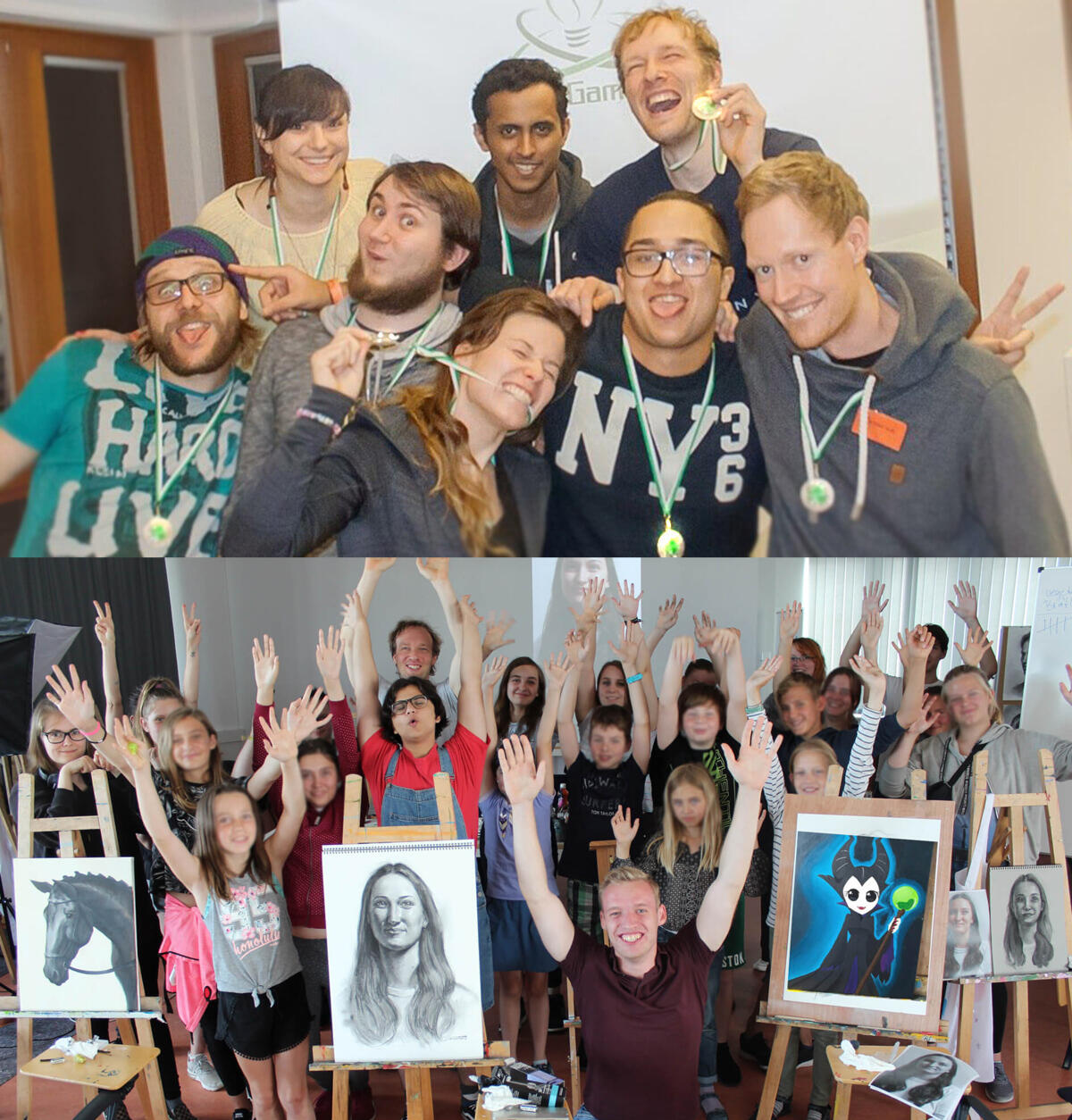 2020-2024: ライブポートレート、シーン描画、グラフィックレコーディングの依頼が殺到 ライブ描画の仕事がこれほど発展するとは驚きでした。素晴らしいクライアントに恵まれ、仕事は多種多様で、報酬も納得のいくものでした。正直、「ドイツはアーティストには向かない国だ」と思っていましたが、その考えは完全に変わりました。これほどアーティストが重宝され、高い報酬が得られる国を私は他に知りません。特にキャリア初期、KSK(芸術家社会保険)制度には本当に助けられました。ライブ描画の幅をシーン描画やグラフィックレコーディングへ拡大 ポートレートを描くのは大好きですが、何千、何万という人を描き続けるのはかなりのプレッシャーでもあります。そこで、シーン描画やグラフィックレコーディングを始めました。これらはイベント中に情報を収集し、後から調整もできるため、数分で完璧に仕上げなければならないポートレートとは違う楽しさとリラックス感があります。マンガ完全オンライン講座の制作と2冊のマンガ技法書の出版 最初の線から解剖学、そしてマンガの1ページを完成させるまでを網羅した巨大な講座を作りました。当初はポートレートに専念するつもりでしたが、マンガの描き方への要望があまりに多く、講座と本の両方を制作しました。マンガは私が絵を始めるきっかけであり、今でも私の心の拠り所です!