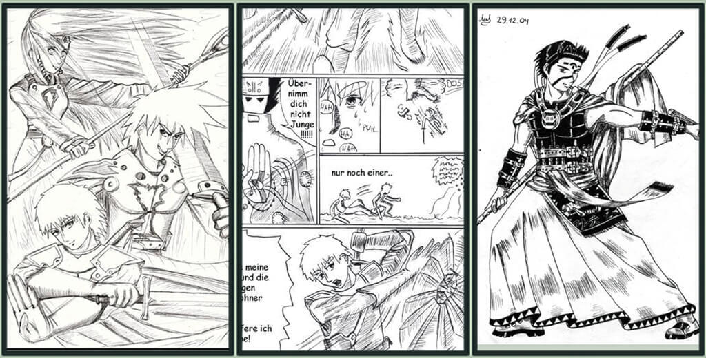 当時は「書くこと」も私にとって大きな情熱の一つでした。自由な時間はすべて、スポーツ、絵、そして執筆活動に注いでいました。少しずつインク(墨)を使った描き方にも慣れてきた頃です。カンフーを習っていたこともあり、格闘シーンを描くのが何よりの楽しみでした。
